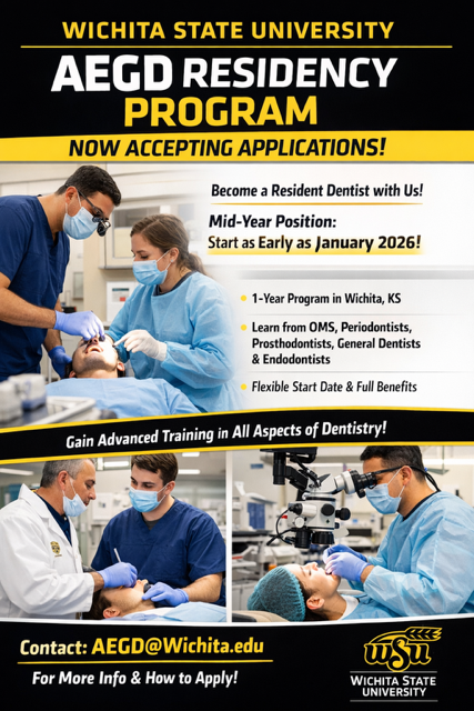 Are you struggling with an associate position and wish you had done a residency? Are you thinking about a specialty school, and would like to boost your application with an AEGD certificate? Wichita State University AEGD has an immediate opening for a mid-year, 12 month resident position. We can be flexible with your start date, but can start as early as January/February 2026! Please reach out to aegd@wichita.edu or 316.978.8349 for more information or questions about how to apply.