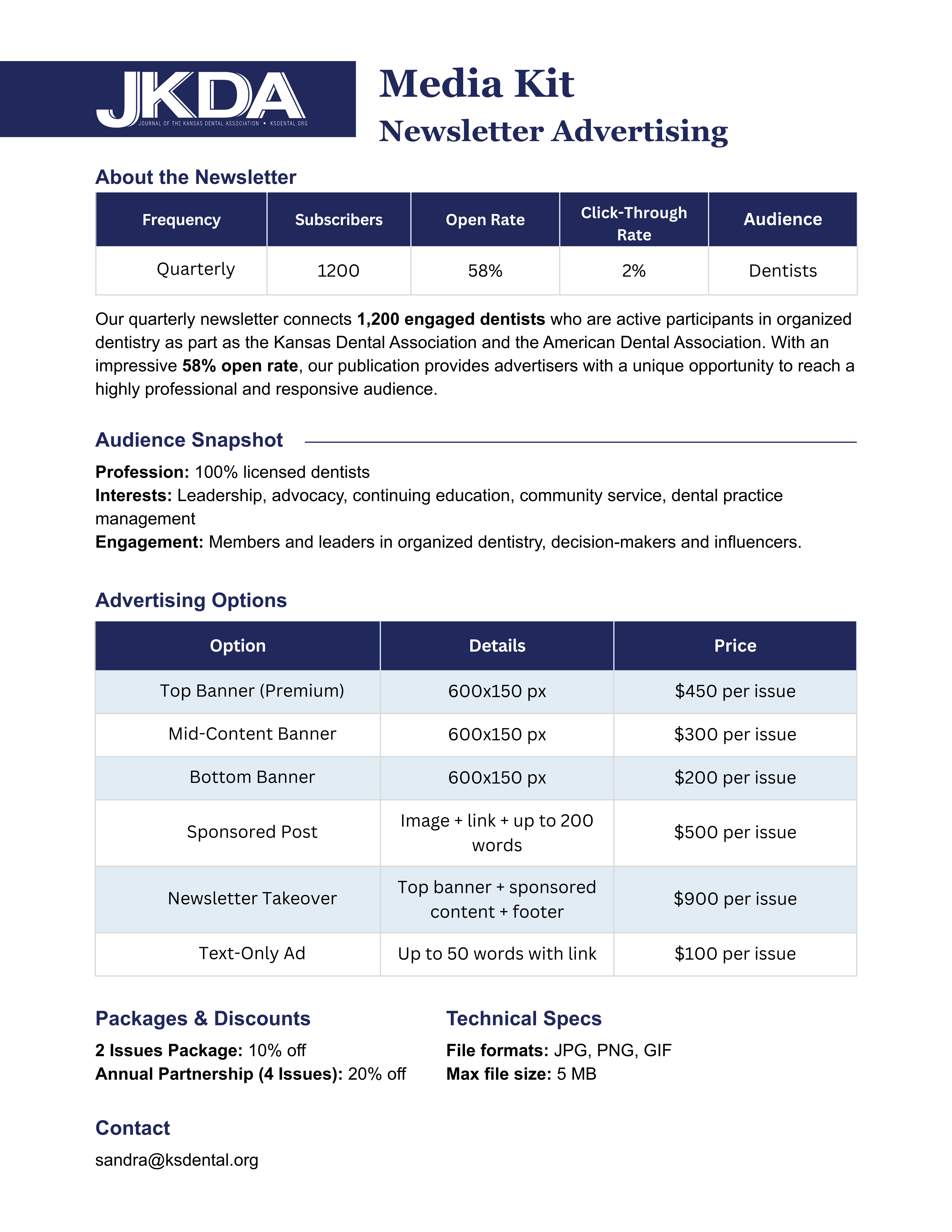 The Journal of the Kansas Dental Association (JKDA) is the official publication of the Kansas Dental Association. Each issue is packed with a variety of articles of importance to dentists practicing in Kansas, such as association and legislative news, feature articles, and editorials. The JKDA is the only journal of its kind in Kansas and is produced quarterly as an digital publication. The JKDA is emailed directly to over 1,000 KDA members (totaling 65-70% of practicing dentists in Kansas), dental students at the University of Missouri-Kansas City, and graduate students at Wichita State University. It is also hosted on the KDA web site and included in the KDA Weekly e-news. You’ll find there’s no better way of reaching the dental community in Kansas than advertising in the Journal of the Kansas Dental Association.